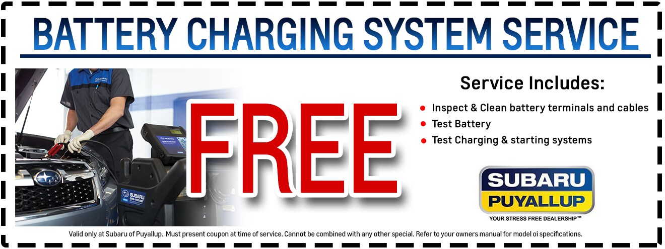 Bring This Coupon To Subaru Of Puyallup, WA And Get Your Vehicle's Battery Charging System Checked At No Additional Cost