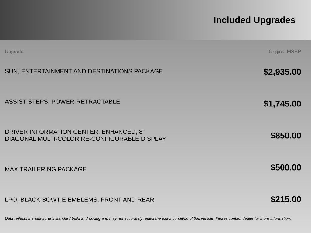 Optional equipment on this Tahoe includes the Sun, Entertainment and Destinations Package, Max Trailering Package, Interior Protection Package, Enhanced Driver Information Center with Head-Up Display, Advanced Adaptive Cruise Control, power-retractable assist steps, and front and rear black bowtie emblems.