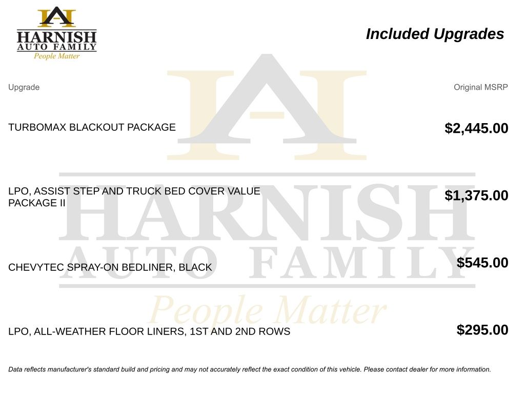 Optional equipment on this Trail Boss includes the TurboMax Blackout Package with black badging, black tailgate lettering, exhaust tip, and 20-inch high-gloss black aluminum wheels, assist step and soft tonneau cover package, ChevyTec spray-on bedliner, and all-weather floor liners.