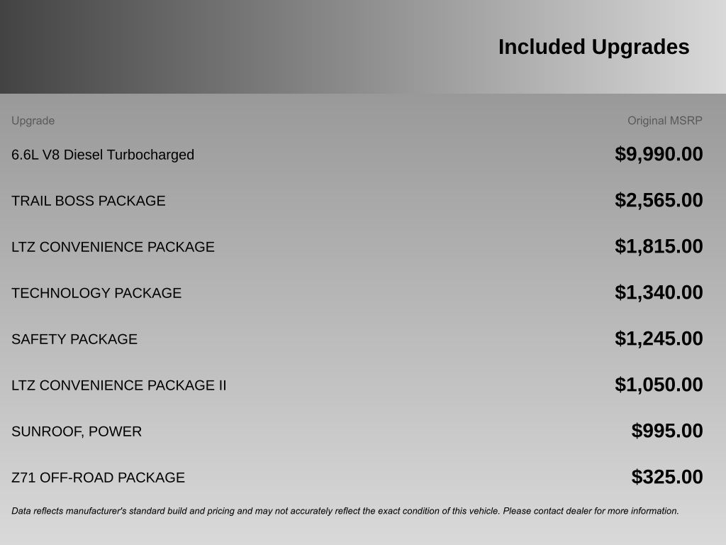 Optional equipment on this Silverado includes the Duramax 6.6L turbo-diesel V8, Allison 10-speed automatic transmission, LTZ Convenience Packages I and II, Technology Package with head-up display and rear camera mirror, Safety Package with HD surround vision and trailer safety features, Z71 Off-Road Package, power sunroof, Trail Boss appearance elements, and Chevytec spray-on bedliner.