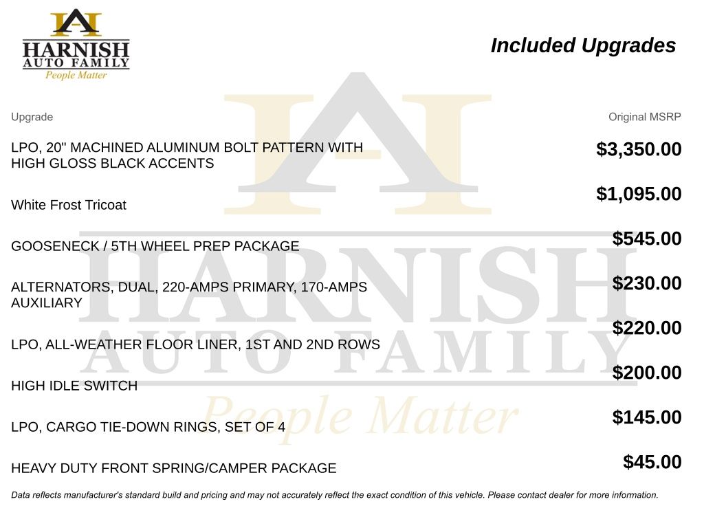 The Duramax diesel paired with the Allison 10-speed delivers the torque you expect for towing and hauling, and the factory gooseneck/5th wheel package means you are ready to hook up a trailer without aftermarket modifications. Dual alternators and the high idle switch are valuable if you run auxiliary equipment or spend time idling on job sites.